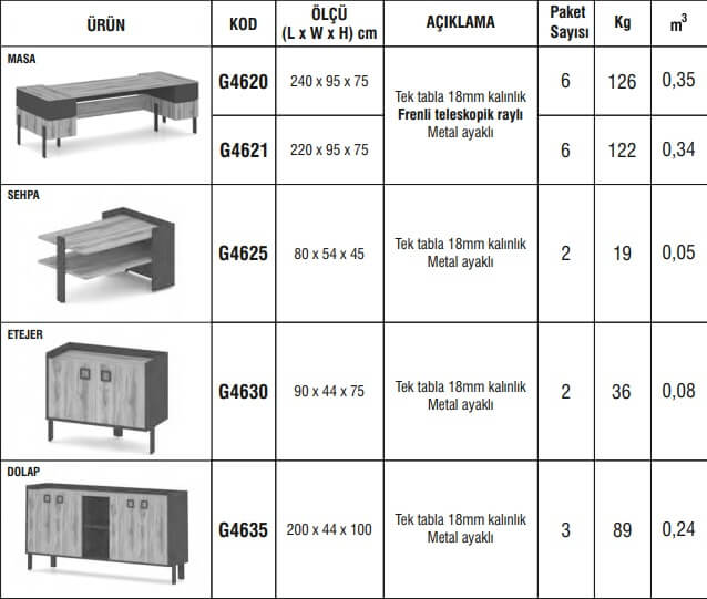 2016 ofis masa takımı, zarif tasarımı ve işlevsel özellikleriyle ofisinize şıklık katarken, çalışma alanınızı organize etmenize yardımcı olur. Takım; masa, sehpa, etajer ve dolaptan oluşan dört parçadan meydana gelir ve her biri hem dayanıklılığı hem de estetiği bir araya getirir.