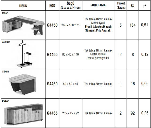 L Masa Takımı, ofisinizde hem şıklığı hem de işlevselliği bir arada sunar. Dayanıklı malzemeleri ve modern tasarımı sayesinde uzun yıllar güvenle kullanılabilir. Farklı renk seçenekleriyle her türlü dekorasyona uyum sağlar ve ofisinizin profesyonel görünümünü güçlendirir.